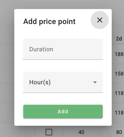 In the window that appears, enter the duration for the new price point using Hours, Days, or Weeks.